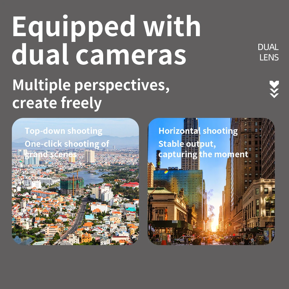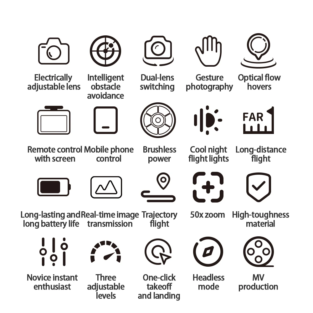 One click takeoff/landing/ascent/descent/left/right turn/forward/backward/left/right flight/headless mode/fast/slow mode/photography/video recording/optical flow positioning/dual cameras/gravity sensing