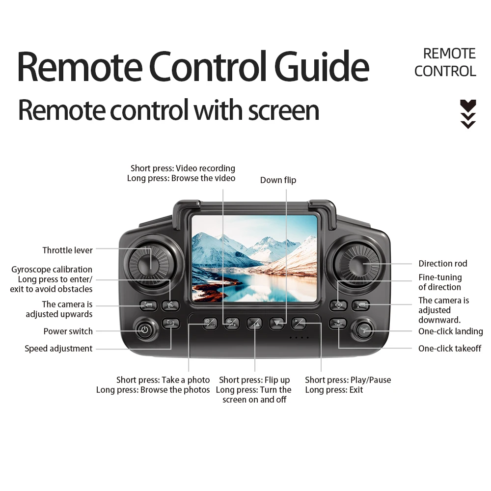 Remote control function: "One click takeoff/one click landing/up/down/left/right turn/forward/backward/left/right side flight/optical flow positioning/dual cameras/camera up/down adjustment headless mode/fast/slow gear/one click reset/long press to avoid obstacles"