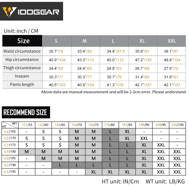 *Please Note: IDOGEAR's pants are a little bigger, please contact IDOGEAR customer service if you are concerned about size selection.
